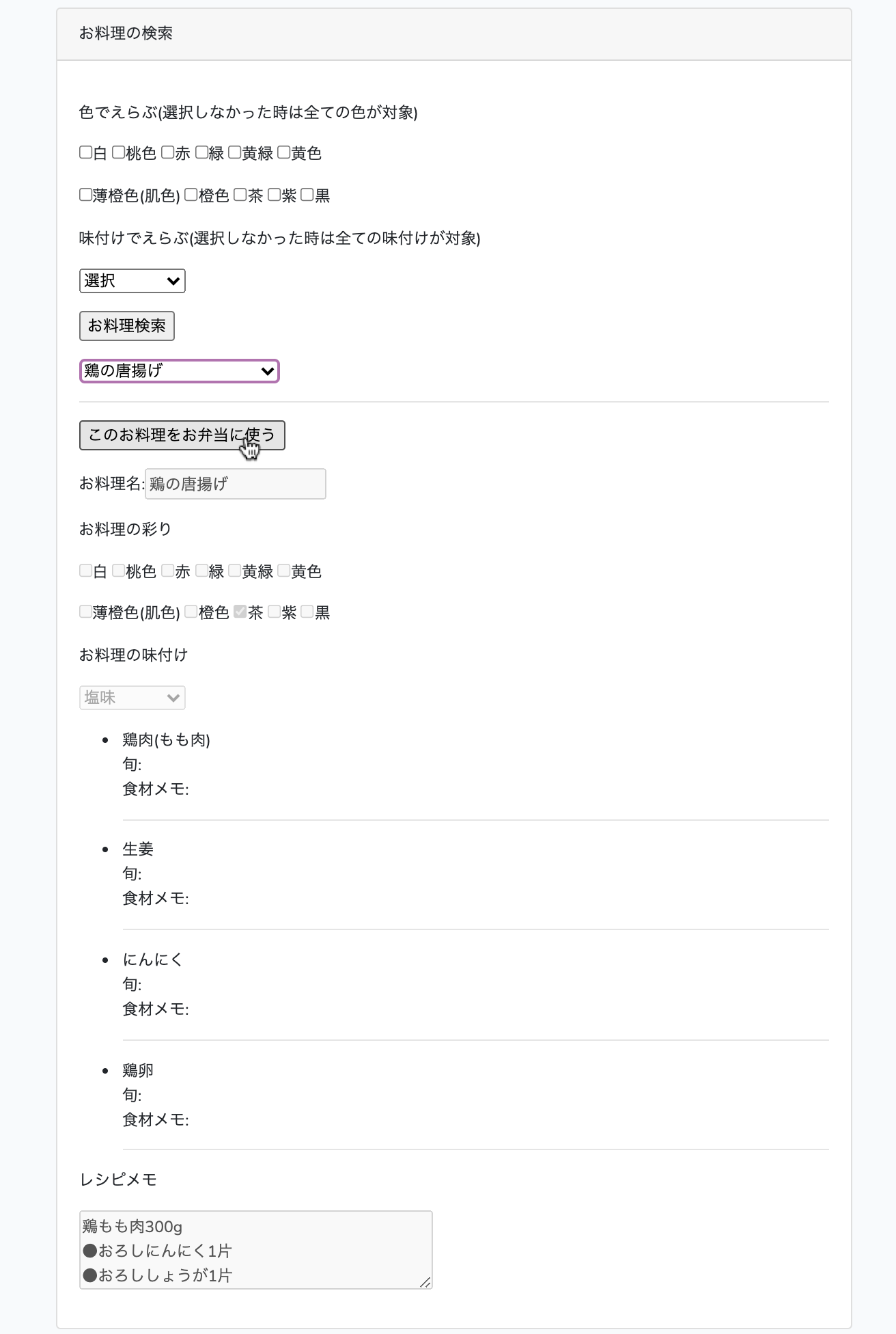 このお料理をお弁当で使う場合は、このお料理をお弁当に使うボタンを押します。